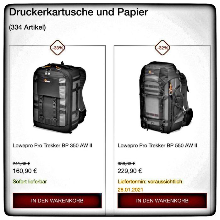 Geht doch? Schaut man sich dann die Details zu so einem Drucker an, dann stellt man schnell fest, so ein paar nicht ganz unwesentliche Informationen fehlen. Etwa wie viele Ausdrucke sind mit dem Bestellumfang möglich. Gibt es Farben und Papier zum Nachbestellen und was kostet das dann. Also noch mal die Suche bemühen... hätte ich das blos nicht gemacht. Die Suche nach "Druckerkartusche und Papier" fördert ein buntes Gemisch an Rucksäcken und Fotobüchern hervor. Dazwischen auch Trageriemen und - oh Wunder - Fotopapier. Jetzt nicht unbedingt passend zu den Druckern, die im Angebot sind, aber immerhin passend zur Suche.