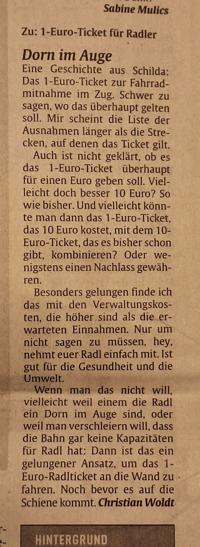 Eine Geschichte aus Schilda: Das ein Euro Ticket zur Fahrradmitnahme im Zug(2).