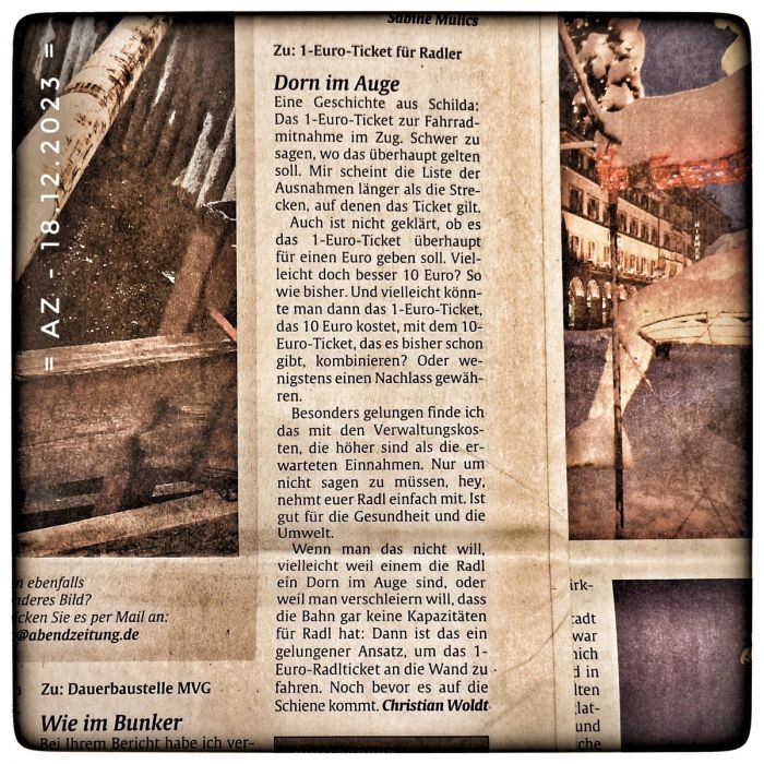Besonders gelungen finde ich das mit den Verwaltungskosten, die höher sind, als die erwarteten Einnahmen. Nur um nicht sagen zu müssen, hey, nehmt euer Radl einfach mit. Ist gut für die Gesundheit und die Umwelt.