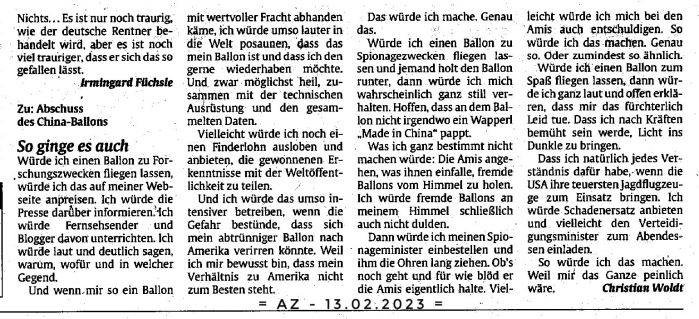 Ja? Würde ich das? Nein, eigentlich würde ich das nicht. Ich denke, ich würde eins dieser Spezialflugzeuge los schicken. So eins das in der Lage ist, einen Ballon vom Himmel zu pflücken. Weil mich würde ja schon interessieren, was da für eine Technik dran hängt an diesem Ballon. Und ob ich dann zu Recht auf China sauer sein muss oder ob auch mal fünf gerade sein lassen kann.