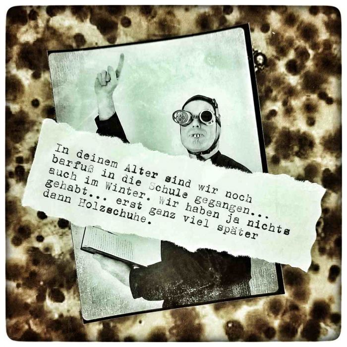 In deinem Alter sind wir noch barfuß in die Schule gegangen... auch im Winter. Wir haben ja nichts gehabt... erst ganz viel später dann Holzschuhe.