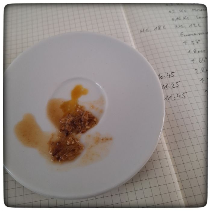 Da heißt es gut aufpassen und viel rühren. Weil es schnell mal ein Temperaturgefälle von 10° zwischen ganz oben und ganz unten gibt. Und man will ja die Temperaturen für die Rasten möglichst genau treffen.