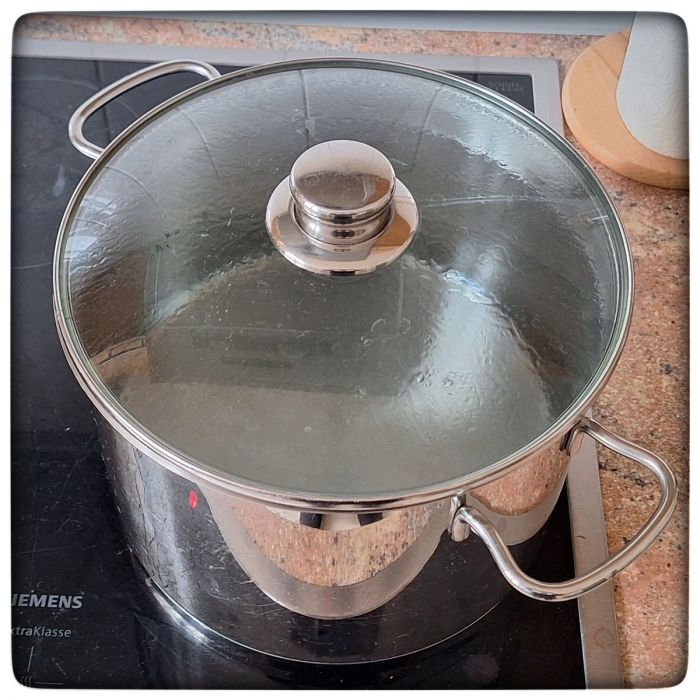 Was der Bielmeier Kochtopf nicht macht, zumindest nicht zuverlässig, das ist kochen. Das will er irgendwie nicht. Vielleicht weil er schon etwas älter ist und die Anstrengung scheut. Jedenfalls werden wir heute einen Tauchsieder mit hinein hängen. Es soll ja kochen. So richtig. Nicht nur vielleicht oder ein bisschen.