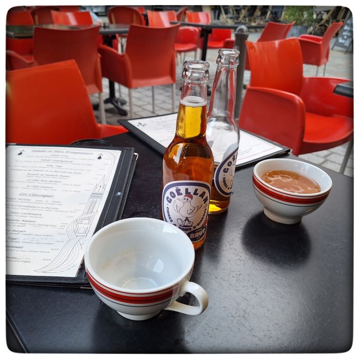 Und ein Bier dazu. IPA ist aus, dann also ein Französisch Blonde. Ok, das geht. Ist nicht besonders bretonisch. Das Bier schon, das war aus Nantes und es war gut. Also wirklich gut. Ein Französisch Blonde. Das kommt unserem Hellen recht nahe, ist süffig und lädt zum Verweilen ein.