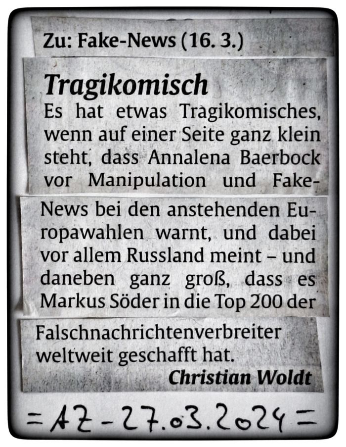 Auf der einen Seite Annalena: Fake News sind blöd. Auf der anderen Seite Söder: Was schert mich das.