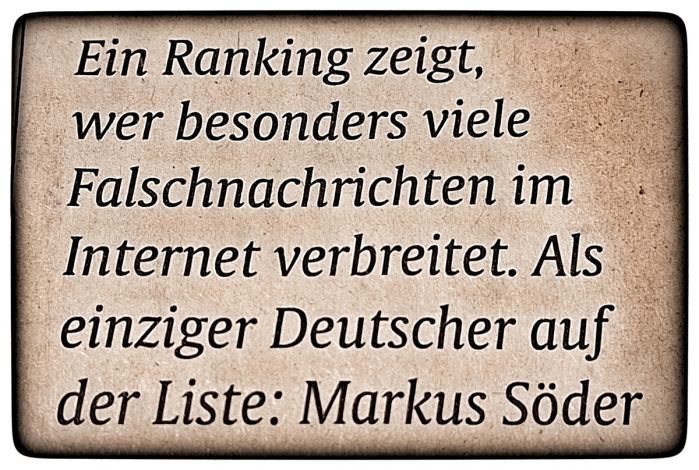Links wird getitelt: "Warnung vor Fake-News". Rechts daneben wird Markus Söder bescheinigt, es als einziger Deutscher in die internationale Liste der 200 schlimmsten Fake-News Verbreiter geschafft zu zu haben. Eine zweifelhafte Ehre.