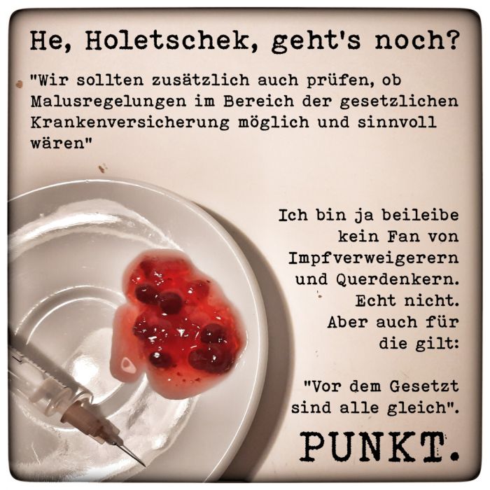 Und jetzt kommt da der Holetschek um's Eck. Also nicht irgendwer, der meint, ein wenig Populismus in die Welt pusten zu müssen. Da kommt ein Gesundheitsminister daher und schwadroniert darüber, ob sich die Krankenversicherung nicht anböte, gefälliges Verhalten zu erzwingen.