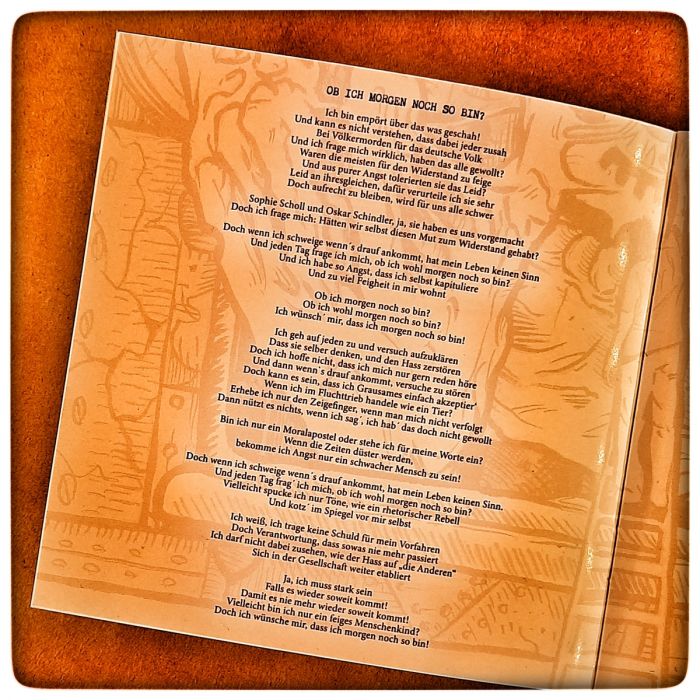 Die Songs überschreiten allesamt die durchschnittliche Aufmerksamkeitsspanne eines durchschnittlichen Konzertgängers. Was auch gut so ist. Denn zum einen - und das ist vor allem auf Konzerten nicht zu unterschätzen - ist es recht schade wenn man sich gerade so schön eingepogt hat und der Song auch gleich schon wieder vorbei ist. Zum anderen - das spielt auf Konzerten gemeinhin nicht so eine große Rolle - haben die Texte geradezu epische Ausmasse. Also nicht so eins, zwei, drei, Pogo, Pogo, Patz, Patz, sondern so richtig mit ganz vielen Zeilen und Inhalt drin. Lohnt sich, in einer ruhigen Minute etwas genauer hinzuhören.