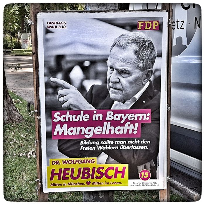 Natürlich hat die FDP ganz viele Gesichter. Sie gleicht quasi einer Hydra. Fällt ein Gesicht ab oder vom Himmel, wachsen sofort zwei Gesichter nach. Aber bei mir ums Eck hat die FDP gerade das Heubisch-Gesicht.