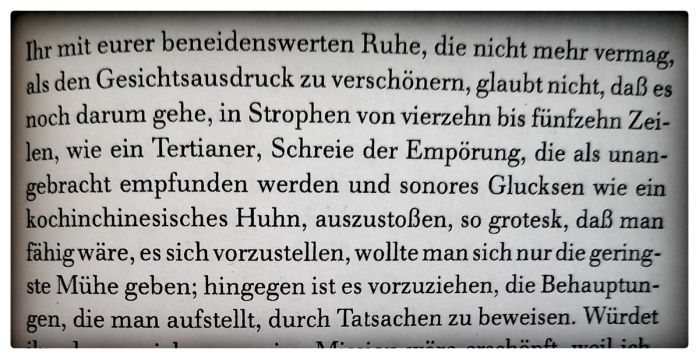 Wobei sich die Absätze erstaunlich flüssig hintereinander weg lesen lassen. Doch jedes weitere Kapitel entlässt mich in Ratlosigkeit. Was habe ich da gelesen? Und warum?