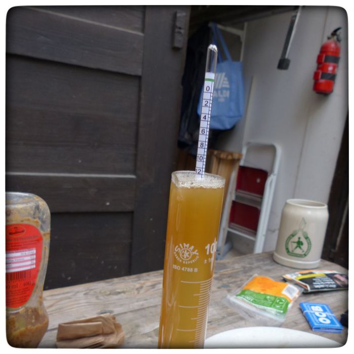 Jetzt ist der Brautag fast vorbei. Etwas muss allerdings noch erledigt werden. Die Würze muss ins Gärfass und da haben wir ganz klar noch etwas Optimierungsbedarf. Denn das Sudhaus ist ebenerdig, das Gärfass steht im Keller. Wegen der Temperatur. Bis uns denn was schlaues eingefallen ist, muss die Würze also per Eimer in den Keller.