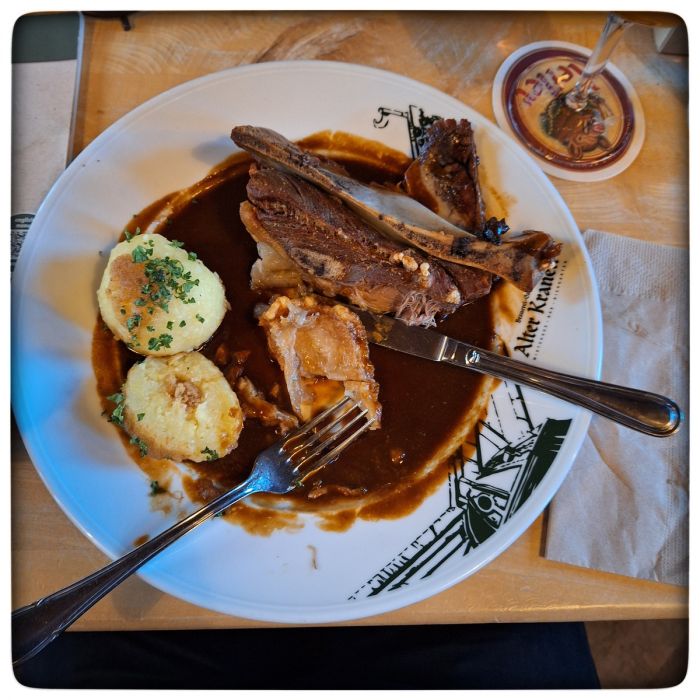 Manchmal, so fragt man sich, warum reihen Menschen Buchstaben aneinander und sprechen dann ganz anders. Da steht dann zum Beispiel Schäufele auf der Speisekarte, spricht man das dann Schäufele, hat man sich flugs als Tourist geoutet. Denn es wird Schäufela gesprochen. Spricht man Schäufela... sann hat man sich als Touri geoutet, der sich anbiedern möchte. Denn der Oberbayer ist nun mal kein Franke. Egal, die fränkische Spezialität ist trotzdem eine Sünde wert.
