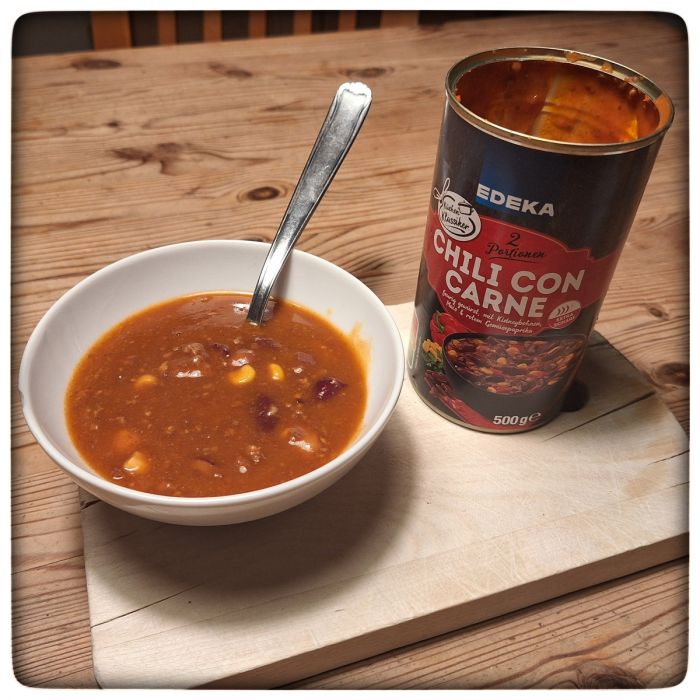 Optisch sieht der Inhalt der Dose schon nach Chili aus. Und, um gleich das Gute vorweg zu nehmen, eine gewisse Schärfe ist dem Machwerk nicht abzustreiten. Das war es aber auch. Geschmacklich erinnert mich das ganze irgendwie an die ebenfalls unsägliche Ochsenschwanzsuppe. War die von Knorr?