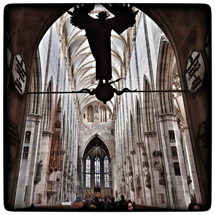 Apropos Geld ausgegangen. Da gehen Großmannssucht und Größenwahn Hand in Hand. Das Ulmer Münster ist nicht - wie sich mein ketzerisches Vorurteil beeilte anzunehmen - durch von der Kirche erhobener Abgaben finanziert. Das haben die Ulmer Bürger und Bürgerinnen aus der eigenen Tasche finanziert. Zu Beginn war die Tasche prall gefüllt. Nach 166 Jahren dann nicht mehr so. In Folge dessen fristete das heute so beeindruckende Bauwerk erst einmal 300 Jahre ein weniger beeindruckendes Dasein. Denn der Turm kam erst später.