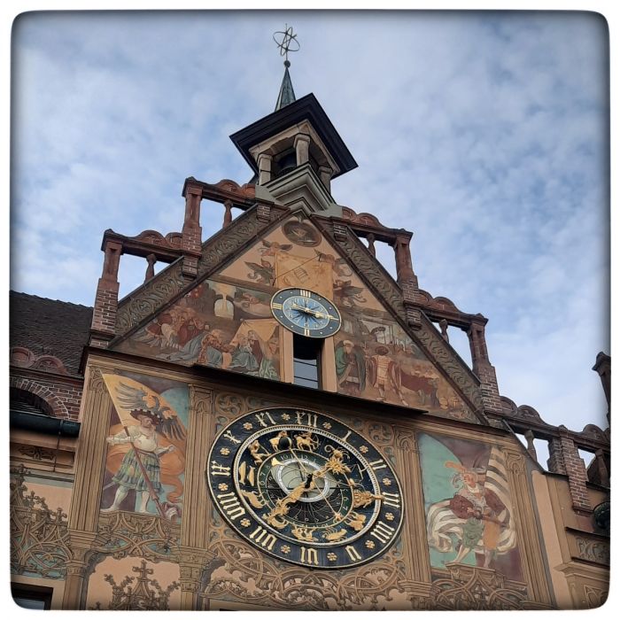 Über das Rathaus gibt es ebenfalls einiges zu sagen. Wen das interessiert... ich verweise auf die Stadtführung. Obwohl, eine Sache fand ich so rührend, die möchte ich kurz erzählen. An der Ostseite des Rathauses sind ein paar prachtvolle Uhren zu sehen. Am auffälligsten zweifellos die astronomische Uhr. Und was sich da alles ablesen lässt. Die Stunden, die Mondphasen, irgendwas mit Sternzeichen, ach herrjeh, das versteht doch niemand. Und weil das niemand versteht und weil die meisten Funktionen im Alltag auch wenig Gebrauchswert haben, gibt es darüber eine zweite Uhr. Die zeigt die Stunden und die Viertelstunden. Das ist schon erheblich realitätsnäher. Weil zu der Zeit das Uhrenlesen noch nicht so verbreitet war, brachte man noch eine Sonnenuhr an. Jetzt vermag ich nicht zu sagen, wie eine Sonnenuhr leichter zu lesen ist, wie eine runde Uhr. Aber geschenkt, denn an der Ostseite zeigt eine Sonnenuhr spätestens ab der Mittagsstunde eh nichts mehr an.