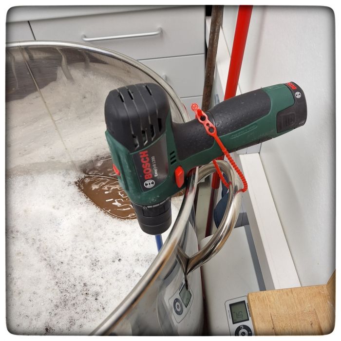 Ein handelsüblicher Quirl für Wandfarbe, ein Akkuschrauber und ein Kabelbinder. Der Akkuschrauber liegt auf dem Topfrand auf und hält durch sein Eigengewicht die Taste gedrückt und sich selbst somit in Aktion. Ein Kühlvorgang von 100 auf 12 benötigt etwa zwei Akkuladungen, das entspricht etwa einer Stunde. So schnell ging das mit dem Plattenkühler nie.