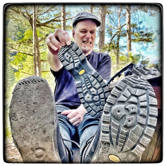 Und wenn man so beschwingt gruppendynamisch durch Wald und Wiesen streift, dann ... streift es einem auch mal die Sohle vom Schuh. Frage nicht. Dann hat man ein bisschen ein Barfuß-Feeling. Das Wandern hat sich damit erledigt.