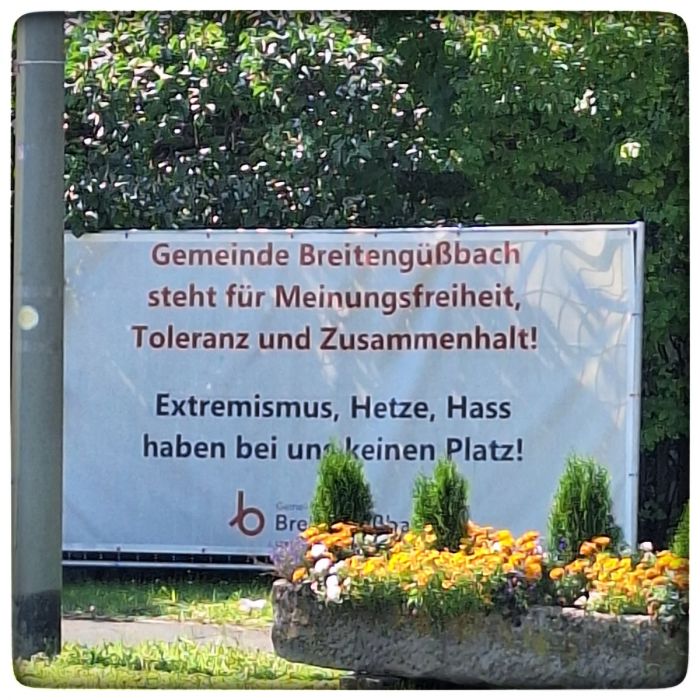 Neben der Kirche von Breitengüßbach prangt ein Transparent, dass dem Besucher klar zu machen versucht, dass Breitengüßbach zwar hässlich und langweilig, nichtsdestotrotz irgendwie bunt ist. Die Erfahrung lehrt einen allerdings, wenn es ein Landstrich notwendig hat, auf sein Buntsein hinzuweisen, dann hat sich der braune Dreck bereits irgendwo hartnäckig festgesetzt.