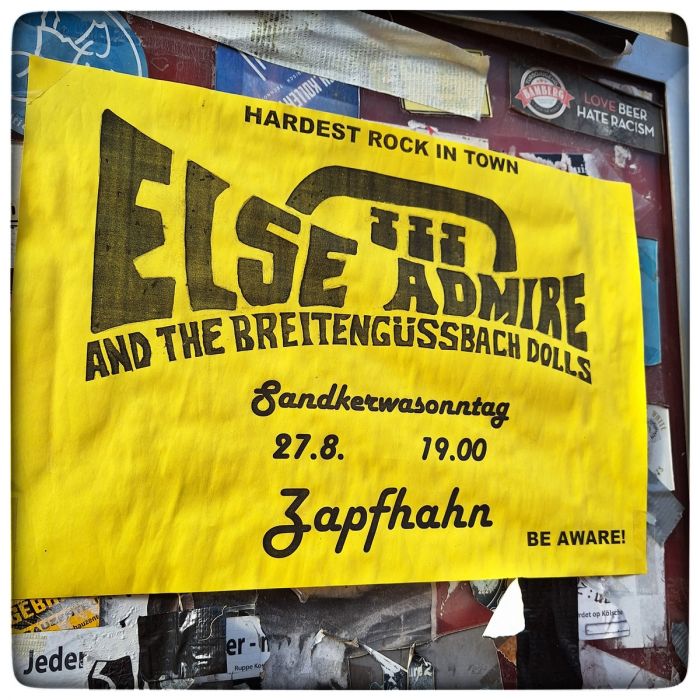 Was gibt es noch über Breitengüßbach zu sagen? Vor vielen Jahren schleppte Sigi Pop mal einen Künstler in die Glocke, der unter dem Namen Else Admire und die Breitengüßbach Dolls firmierte. Nicht dass mich die Veranstaltung nachhaltig beeindruckt hätte, doch irgendwie ist der Name hängen geblieben. Und ich fragte mich, was wohl aus Else Admire geworden sein mag. Und während ich noch darüber sinnierte, ob ich wohl ein YouTube Video finden würde, das ich hier verlinken könnte, stach mir ein Else Admire Plakat ins Auge. Hier also Plakat und Video: