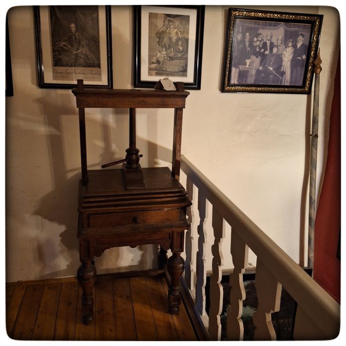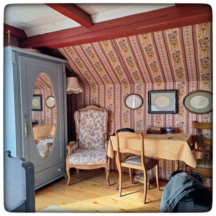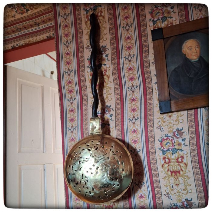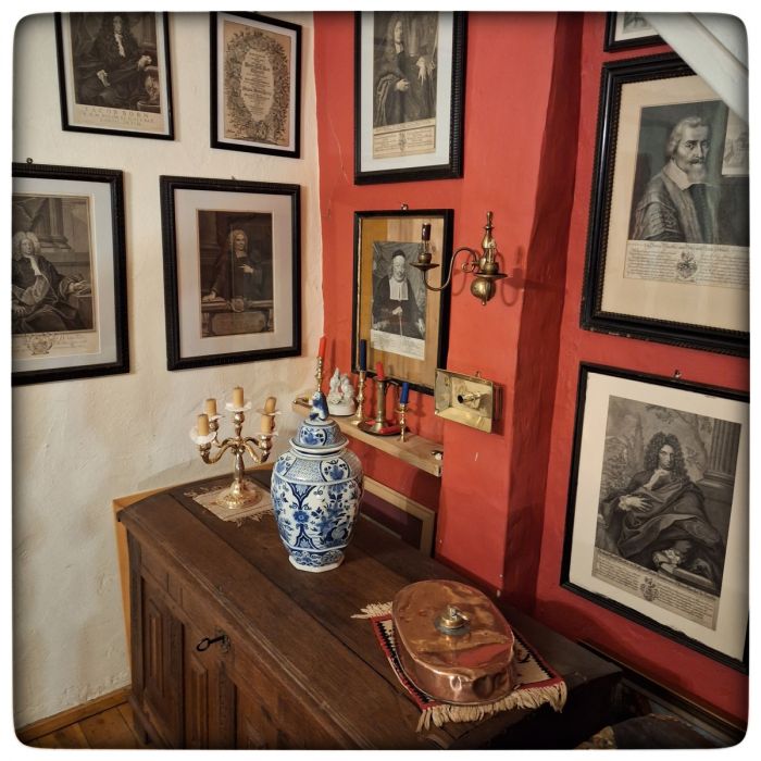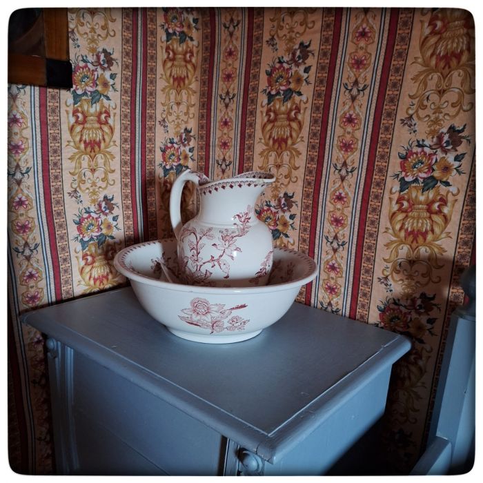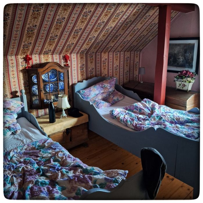 Biedermeier. Original oder gut nachgemacht. Biedermeier an den Wänden, Biedermeiermöbel. Kastenbetten und an der Wand hängt eine Bettpfanne. Neben dem Bett eine Waschschüssel. Man möchte fragen, ob man nicht auch die übrigen Zimmer inspizieren könne.