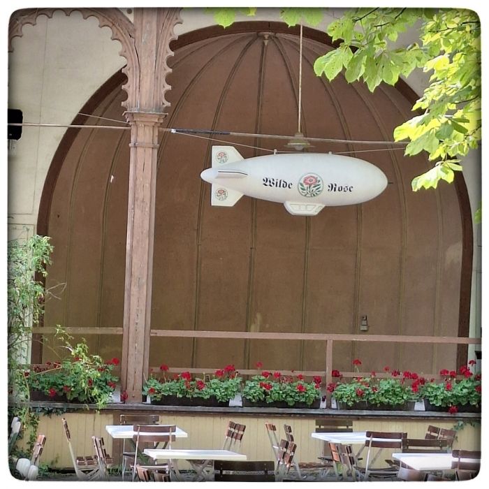 Der Biergarten der Wilden Rose ist ganz nach meinem Herzen. Bäume liefern Schatten. Lange Tafel, Bierartengarnitur, Biergartengarnitur de Luxe, Familientisch, für jeden Anlass die richtige Sitzgelegenheit. Ein feines Kellerbier im Steinkrug und - da habe ich mich bald eine Woche drauf gefreut - Schäuferla mit Klos. Und Sauerkraut, das verstehe ich noch nicht so ganz, das muss ich aber auch nicht aufessen.