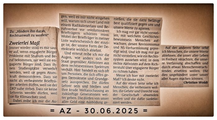 Und erneut reibe ich mir die Augen, wie anders sich der Staat gegenüber - ich möchte hier einfach nicht von engagierten Bürgern und Bürgerinnen reden - Aktivisten aus dem rechtsextremen Spektrum verhält. Hier handelt es sich gerne und oft um Personen, die sich offen gegen Demokratie und Grundgesetz aussprechen. Die dürfen Lehrer sein und bleiben und ihre krude Weltanschauung ungeregelt an zukünftige Generationen weiter geben. Die dürfen von unser aller Geld eine Ausbildung genießen, die sie dazu befähigt best qualifiziert gegen uns und unsere Werte zu agieren.