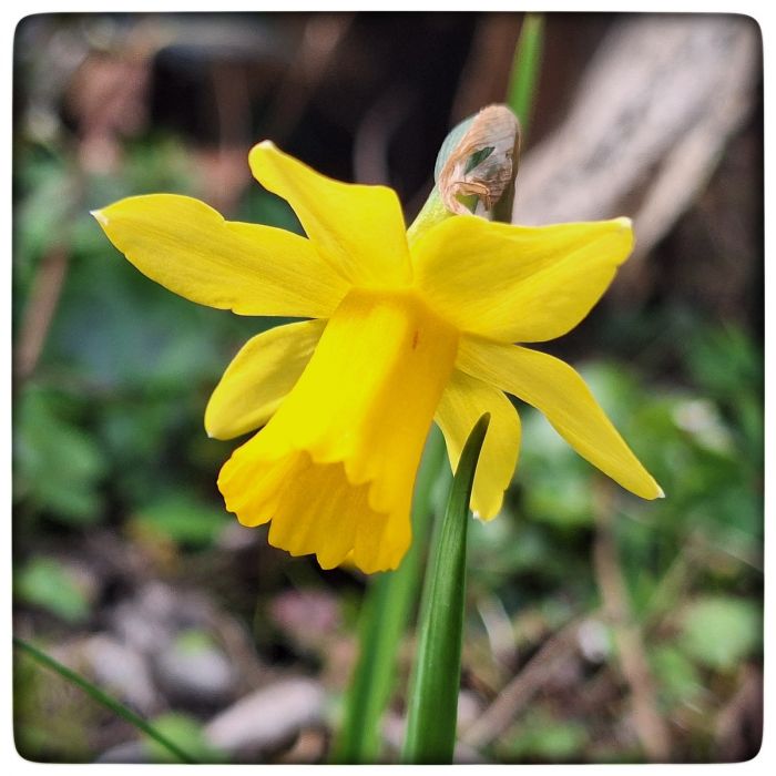 Eine einsame Narzisse in unserem Garten. Niemand weiß, wo die her kommt. Aber sie soll bei uns eine neue Heimat finden. Sie sei unser Gast und bringt Glanz in unsere Hütte.