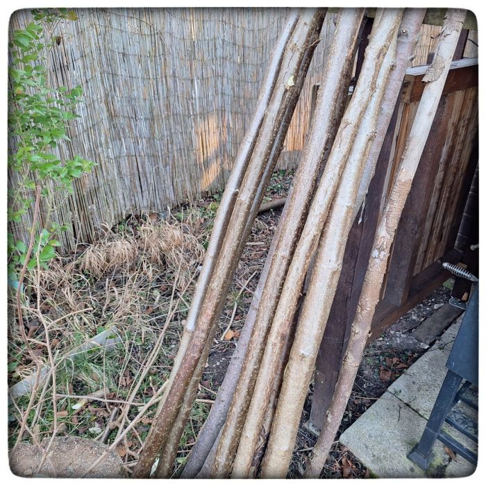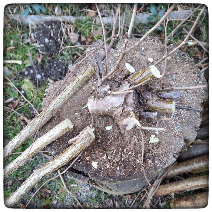 Ich neige dabei zur Radikalität. Ich bin nicht zögerlich. Nicht ein Zweiglein hier ein Asterl dort. Direkt über dem Boden setze ich die Säge an. Weil so ein Hasel austreibt wie blöd. Weil so ein Hasel Triebe hat wie haste nicht gesehen. Weil ich gerne möglichst lange Stangen habe, die ich weiter verwenden kann. Für Stangenbohnen zum Beispiel.