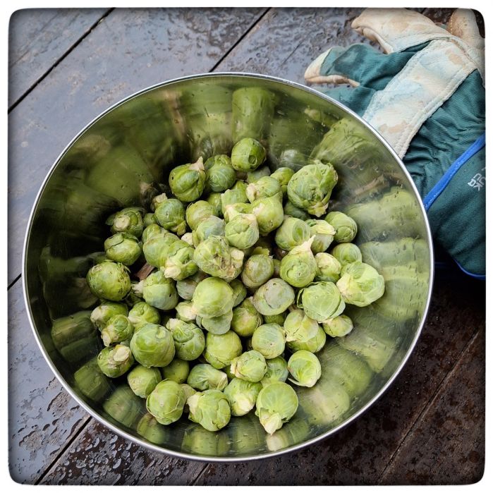 Heute habe ich sozusagen eine Doppelernte eingefahren. Die letzte Ernte der Saison und die erste Ernte in diesem Jahr. Beide zusammen in eine Schüssel gepackt ergibt das eine Woche Rosenkohl zum Abendessen.