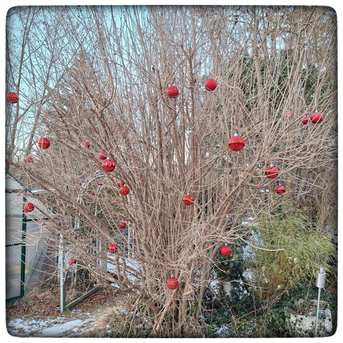 Dass ein Sommer Flieder im Sommer mit Blütenbracht und Aromawolken zu gefallen trachtet, das ist mir bekannt. Dass sich ein Sommer Flieder auch im Winter königlich zu schmücken weiss, das ist mir neu. Sind es Blüten? Sind es Früchte? Ich behalte das mal im Auge.