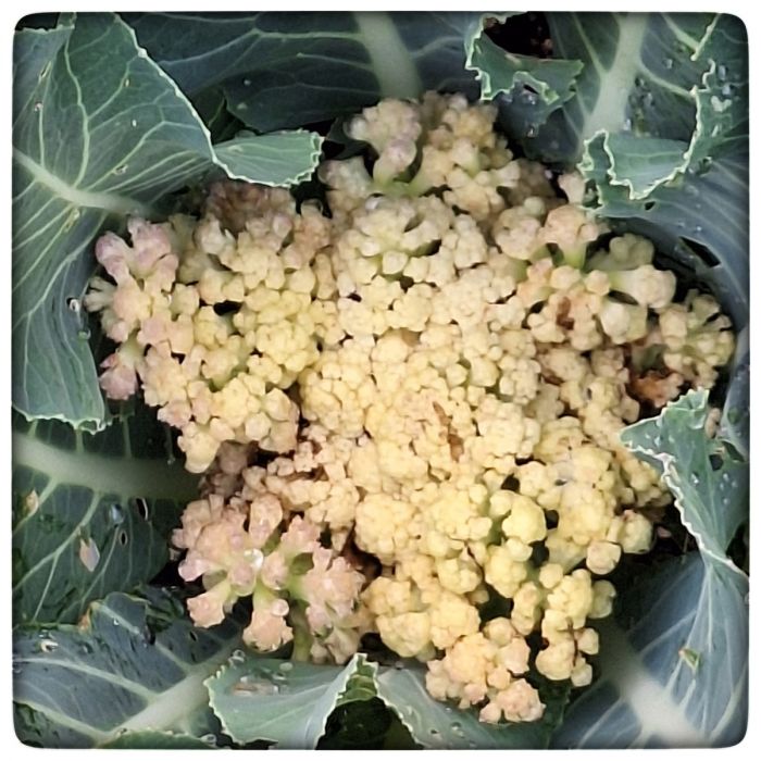 Jetzt weiß ich, warum er so zaghaft ist. Den Röschen bekommt nämlich die Sonne nicht recht. Und haschen sie zu viel Sonne, fangen sie an, sich zu verfärben. Lila, blau, vielleicht auch braun. Das tut Qualität und Geschmack keinen Abbruch. Und es gibt auch Blumenkohlsorten, die extra so gezüchtet werden. Also so, dass sie zu viel Sonne bekommen und sich lila färben. Aber mögen tut die Pflanze das nicht. Wir mögen das ja auch nicht, wenn sich unsere Haut rot, violett oder schwarz verfärbt.