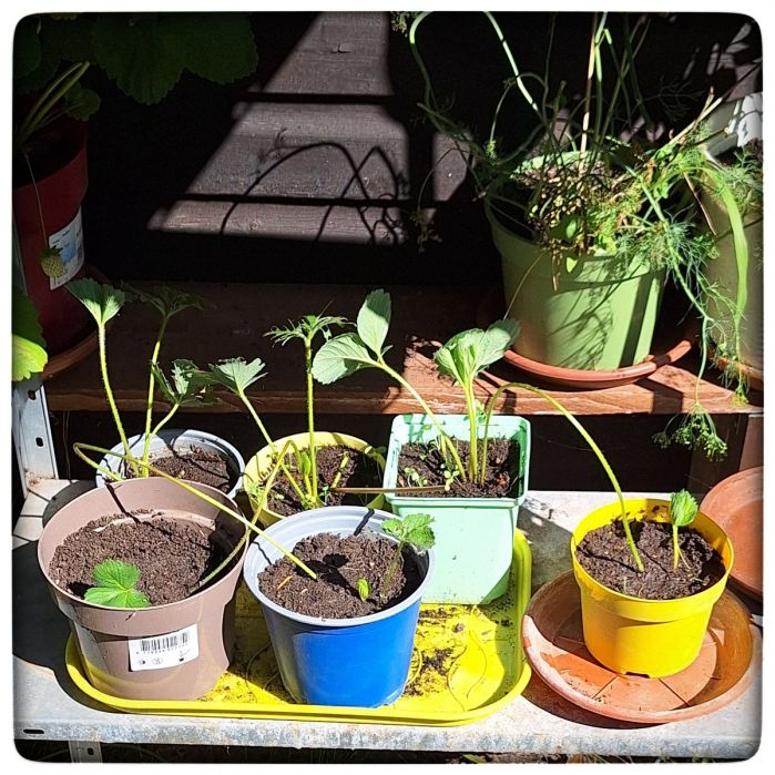 Nun habe ich eine Erdbeerpflanze im Topf und unter strenger Beobachtung. Und diese Pflanze produziert Ableger. Und die Ableger produzieren Ableger. Ich bin mir sicher, auch die Ableger der Ableger produzieren Ableger.