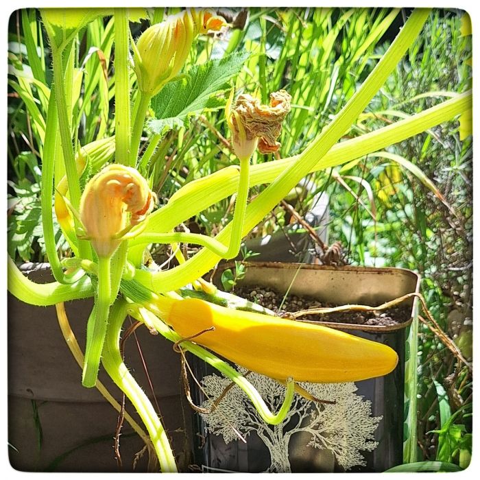 An allen Ecken spitzen sie durchs grüne Blattgewirr. Hier eine Zucchini, dort eine Gurke. Da ein Apfel, dort eine Kaki. Aber der Reihe nach.