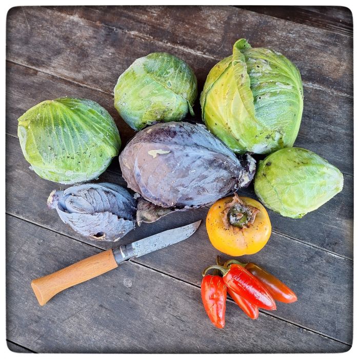 Also ist das nicht die letzte Ernte. Warum also das? Ich glaube, das ist meine erste Ernte, die durch und durch durchgefroren ist. Ich bin mir sicher, der Kohl kommt damit klar. Die Chilis? Die Kaki? Ich werde sehen.