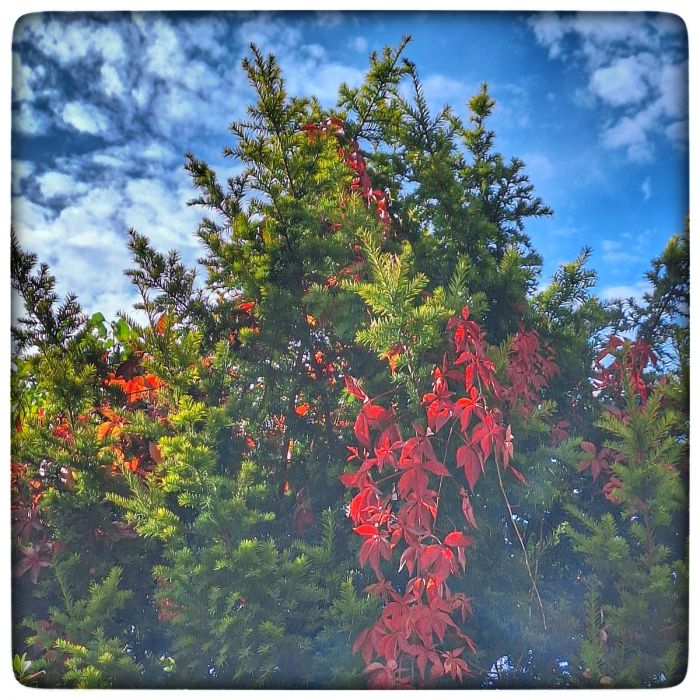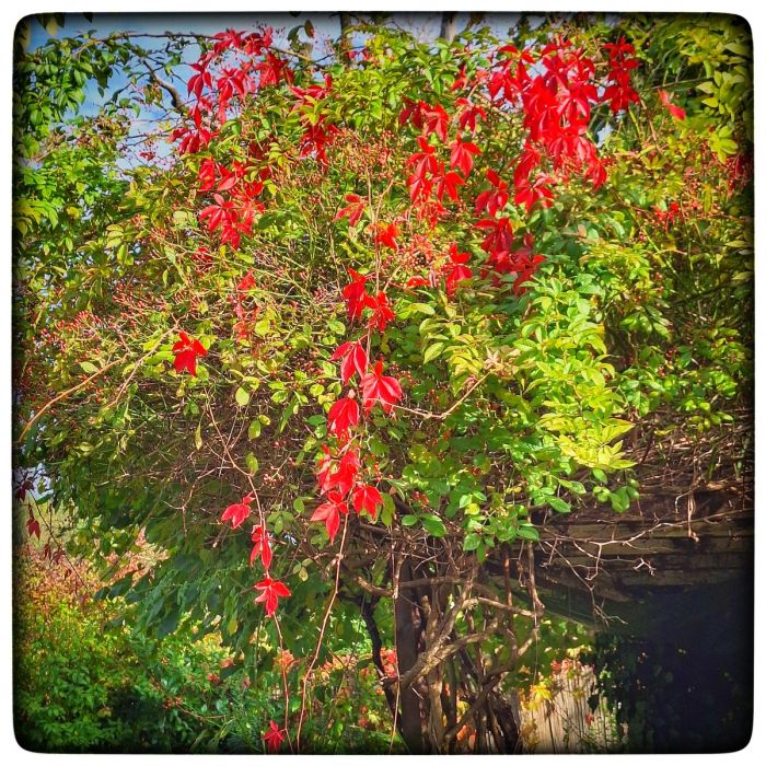 Wenn man invasive Fremdvegetation nicht bei Sicht und Zeiten heraus reißt, rodet und entfernt kann man sich manchmal überraschen lassen. Zum Beispiel von dem wunderbaren Farbenspiel, dass wilder Wein im Herbst vollführt.