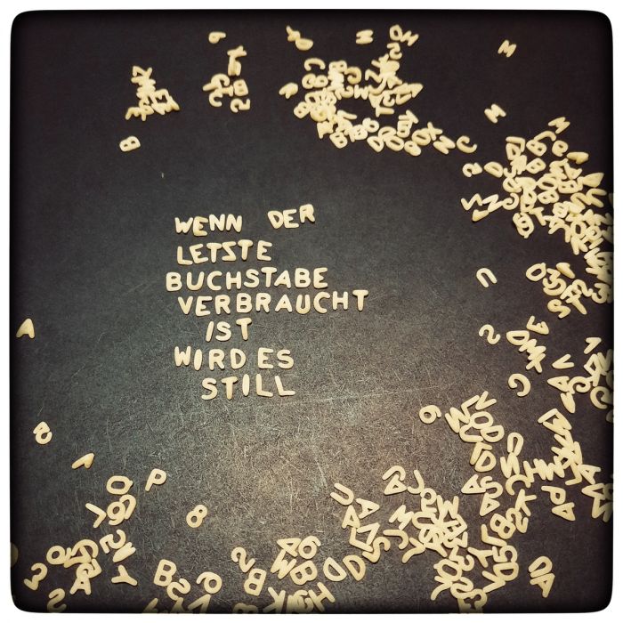 Stellt euch mal eine Buchstabennudelsuppe vor. Die allmächtige Kelle verteilt die Suppe mit den Nudeln - mal mehr, mal weniger - gerecht auf die Teller, die das Leben bedeuten. Voller Freude schöpft man nun aus dem Vollen. Präsentiert stolz komplizierte Satzgefüge, die man aus dem Inhalt eines Löffels zaubern kann. Stellt sich langsam das erste Sättigungsgefühl ein, erlahmt auch das Interesse an ausgefeilten Formulierungen. Man löffelt die Buchstaben ohne Sinn und Verstand in sich hinein. Erst spät merkt man, dass die Buchstaben immer spärlicher in der Brühe dümpeln. Man versucht aus den letzten Resten noch sinnvolles zusammen zu kratzen. Doch irgendwann ist der letzte Löffel gelöffelt und es wird stumm bei Tisch.
