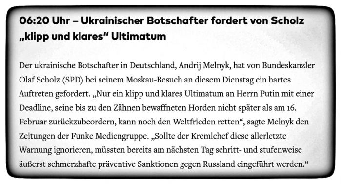 (1) [Welt] 15.02.2022: Ukrainischer Botschafter fordert von Scholz „klipp und klares“ Ultimatum