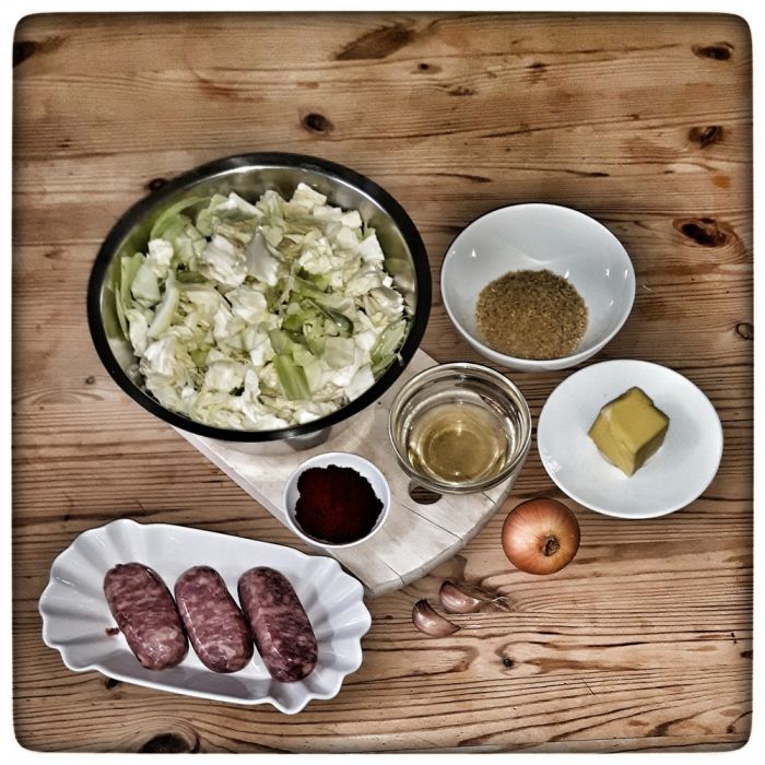 Ich gebe die Butter mit dem Bulgur zusammen in einen großen Topf. Wenn die Butter geschmolzen und mit dem Bulgur gut verrührt ist, gebe ich das Wasser hinzu. Aufkochen und Kohl, Zwiebeln und Salsicce hinzugeben. Aufkochen und dann gut 20 Minuten ziehen lassen. Zuletzt Knoblauch und Essig dazu, erneut aufkochen und mit Salz abschmecken.