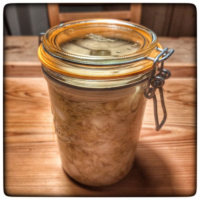 Der Kohl kommt dann in einen Gärtopf. Oder ein Einmachglas. Wichtig ist, dass der Kohl mit Flüssigkeit bedeckt ist. Dazu bietet es sich an, den Kohl mit zum Beispiel Steinen unter Wasser drücken und halten.