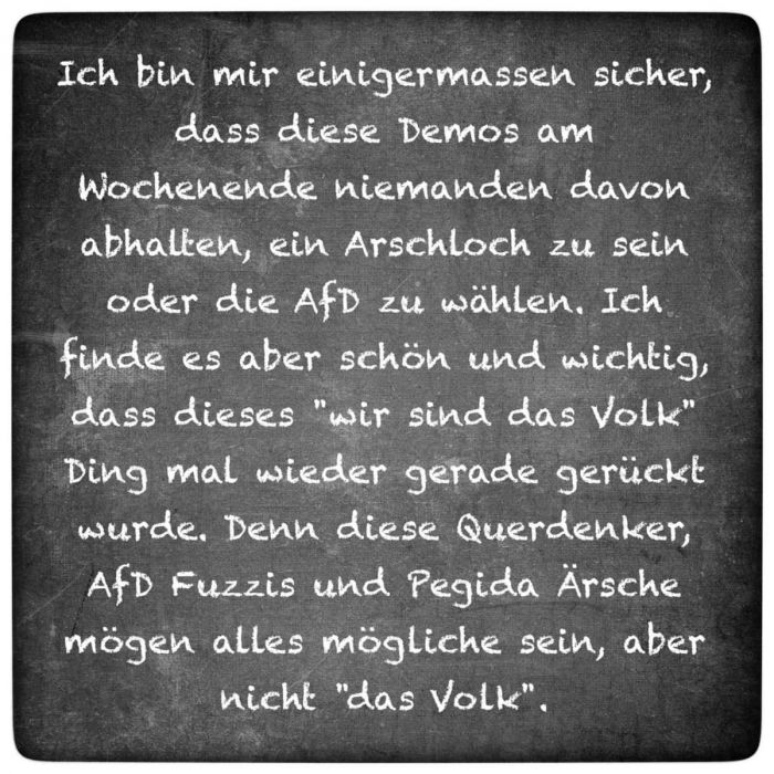 Ist es doch so, dass wärend auf den Straßen Zeichen um Zeichen gesetzt werden, gleichzeitig die Fressen der AfD durch die Talkshows der Öffentlich Rechtlichen irrlichtern.