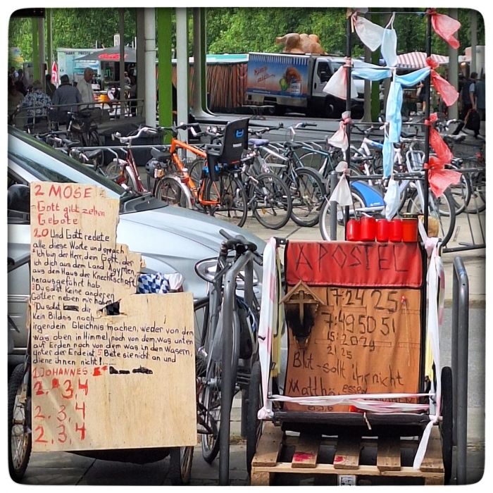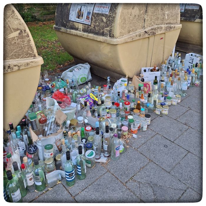 Bewunderung, weil sich jemand die Mühe macht, all diese Flaschen und Gläser so akkurat um die Container zu drapieren. Ist es stiller Protest, der ins Auge springt? Ist es eine Art Performance. Also eine Kunstinstallation, die mit den Konsumgewohnheiten der Großstadt spielt? Oder verbirgt sich dahinter eine zwanghafte Natur, die Unordnung nicht ertragen kann?