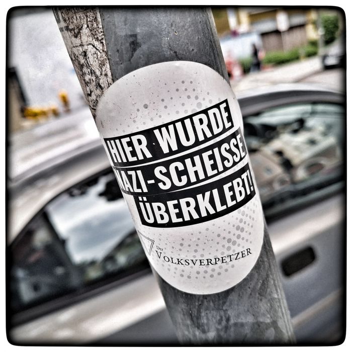 Wisst ihr, was ich an diesem Aufkleber zum Kotzen finde? Nein? Dass unter diesem Aufkleber Nazi-Scheisse klebt. Und dass es so viel Nazi-Scheisse gibt, dass jemand extra Aufkleber machen muss, um diese Nazi-Scheisse zu überkleben.