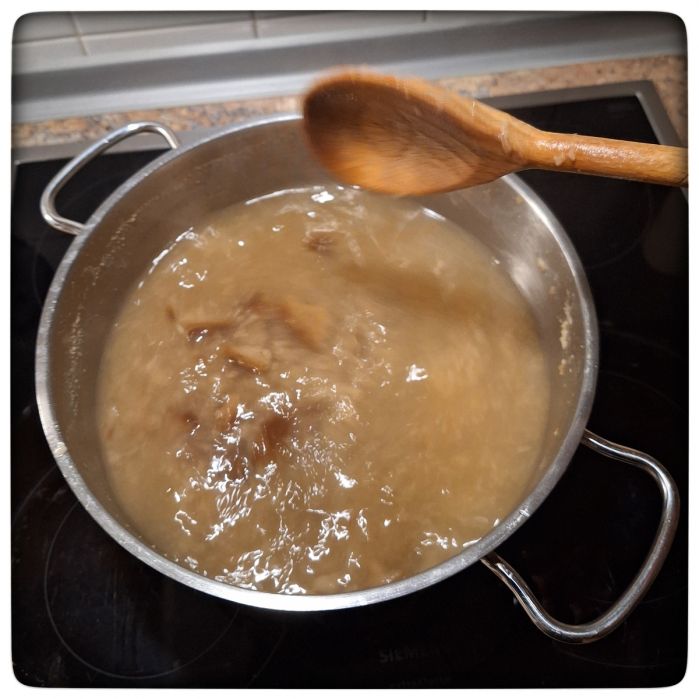 Also das Rezept Pi-mal-Daumen umgerechnet und dabei festgestellt, dass die heimische Küche eh keinen Bottich für 12 Liter bereit hält. 5 Liter ist das Maximum. Also noch einmal umrechnen. Heraus gekommen ist letztlich dieses Rezept: