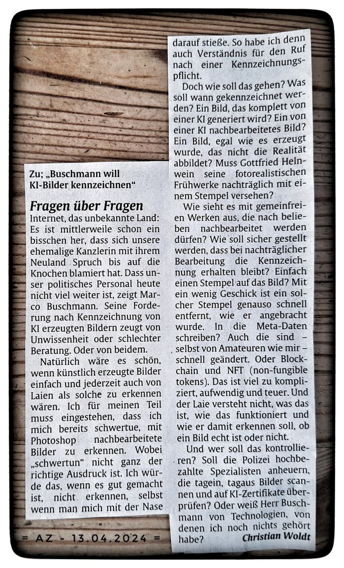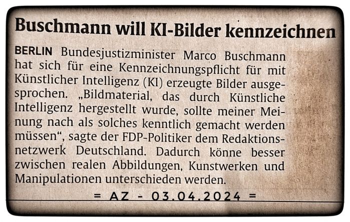 So habe ich denn auch Verständnis für den Ruf nach einer Kennzeichnungspflicht. Doch wie soll das gehen? Was soll wann gekennzeichnet werden? Ein Bild das komplett von einer KI generiert wird? Ein von einer KI nachbearbeiteten Bild? Ein Bild, egal wie es erzeugt wurde, das nicht die Realität abbildet? Muss Gottfried Helnwein seine fotorealistischen Frühwerke nachträglich mit einem Stempel versehen?