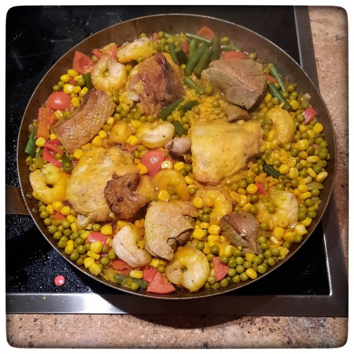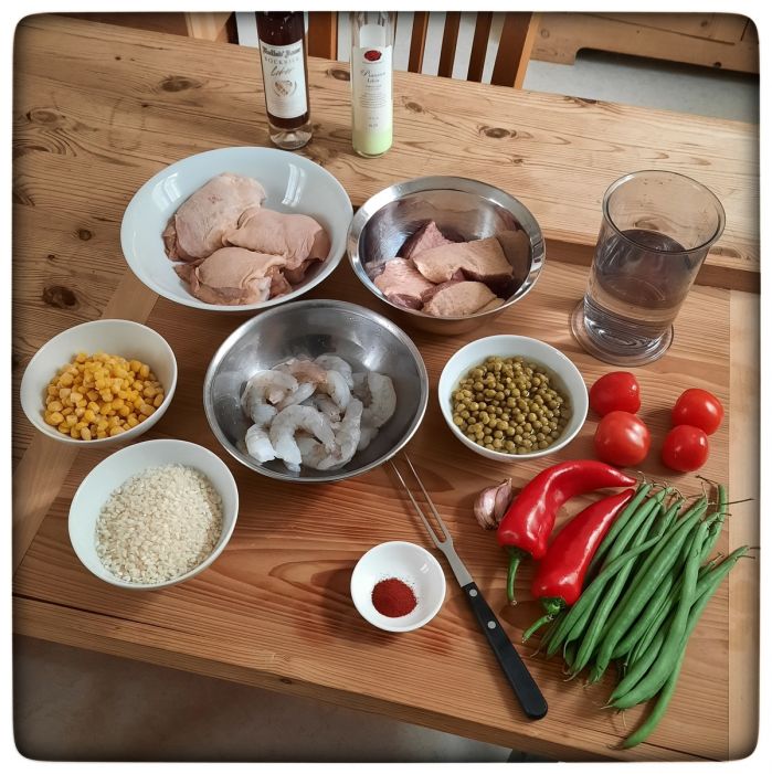 So eine Paella besteht ja nicht nur aus Reis. Da kommen je nach Gusto, respektive Region oder Jahreszeit verschiedene Zutaten in Frage. Bereitet man eine Paella an der Küste zu, empfehlen sich frische Meeresfrüchte. In München ist jetzt nicht viel Küste, da muss man sich aus der Tiefkühltruhe bedienen. Und kocht man im Winter, dann kommt das Gemüse ebenfalls aus der Tiefkühltruhe oder aus der Dose.
