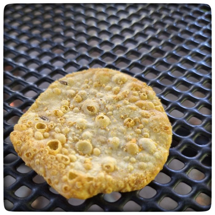 Optisch erinnern die Chips tatsächlich jenen Papadam Fladen aus meiner Erinnerung. Auch die Haptik ist sehr ähnlich. Also ab in den Mund und... aha, da ist sie die Enttäuschung. Der erhofft exotische Geschmack ist bestenfalls angedeutet. Der Mund füllt sich mit Bröseln, die Brösel werden zu Staub. Alles verbindet sich zu einem trockenen Brei, der danach lechzt, von irgendwas hinunter gespült zu werden.