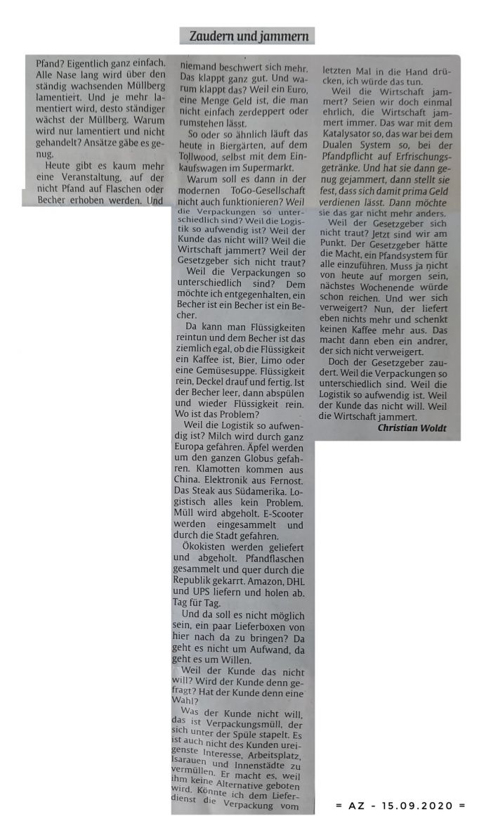 Warum soll es dann in der modernen ToGo-Gesellschaft nicht auch funktionieren? Weil die Verpackungen so unterschiedlich sind? Weil die Logistik so aufwendig ist? Weil der Kunde das nicht will? Weil die Wirtschaft jammert? Weil der Gesetzgeber sich nicht traut?