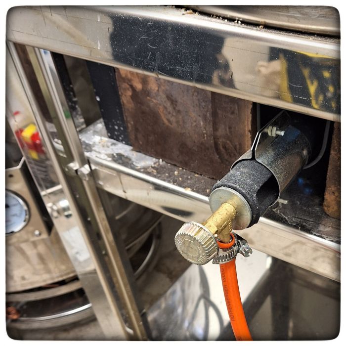 Die Gasanschlüsse der Polsinelli Brenner passen nicht zu den handelsüblichen Schlauchsystemen aus Baumarkt uns Fachhandel hierzulande. Wir haben entsprechend einen Schlauch genommen und im wörtlichen Sinne aufgebohrt, damit er an die Polsinelli Düsen passt. Dann mit einer Schlauchschelle festgeschraubt.