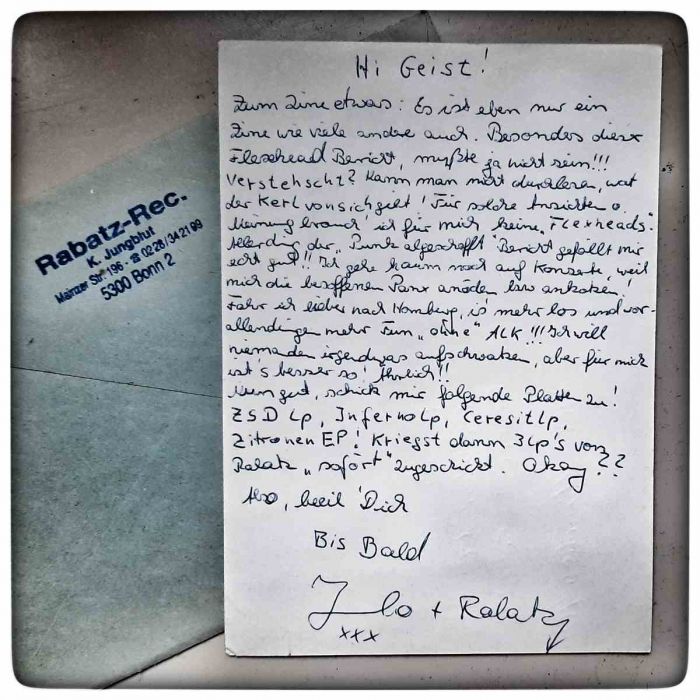 Und weil ich jetzt ein wenig im Archiv gewühlt hab: Es war der Klaus - oder Jumbo, wie er sich damals nannte - der mich angeschrieben hatte. Mit der Bitte, ob ich nicht ein paar Rabatz LPs abnehmen möchte. Die Bitte erreichte mich zwei Mal. Hab wohl auf seinen ersten Brief nicht schnell genug geantwortet.
