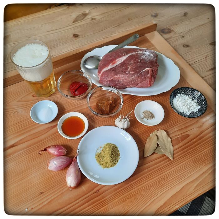 Die Schalotten scheiblieren - (Scheiblieren? Das ist mir jetzt so raus gerutscht. Hört sich aber irgendwie toll an, so professionell.) - und mit dem Knoblauchzehen - kleingeschnitten, gepresst oder im Ganzen - in den Topf. Kurz anbraten und mit Bier und Brühe löschen.